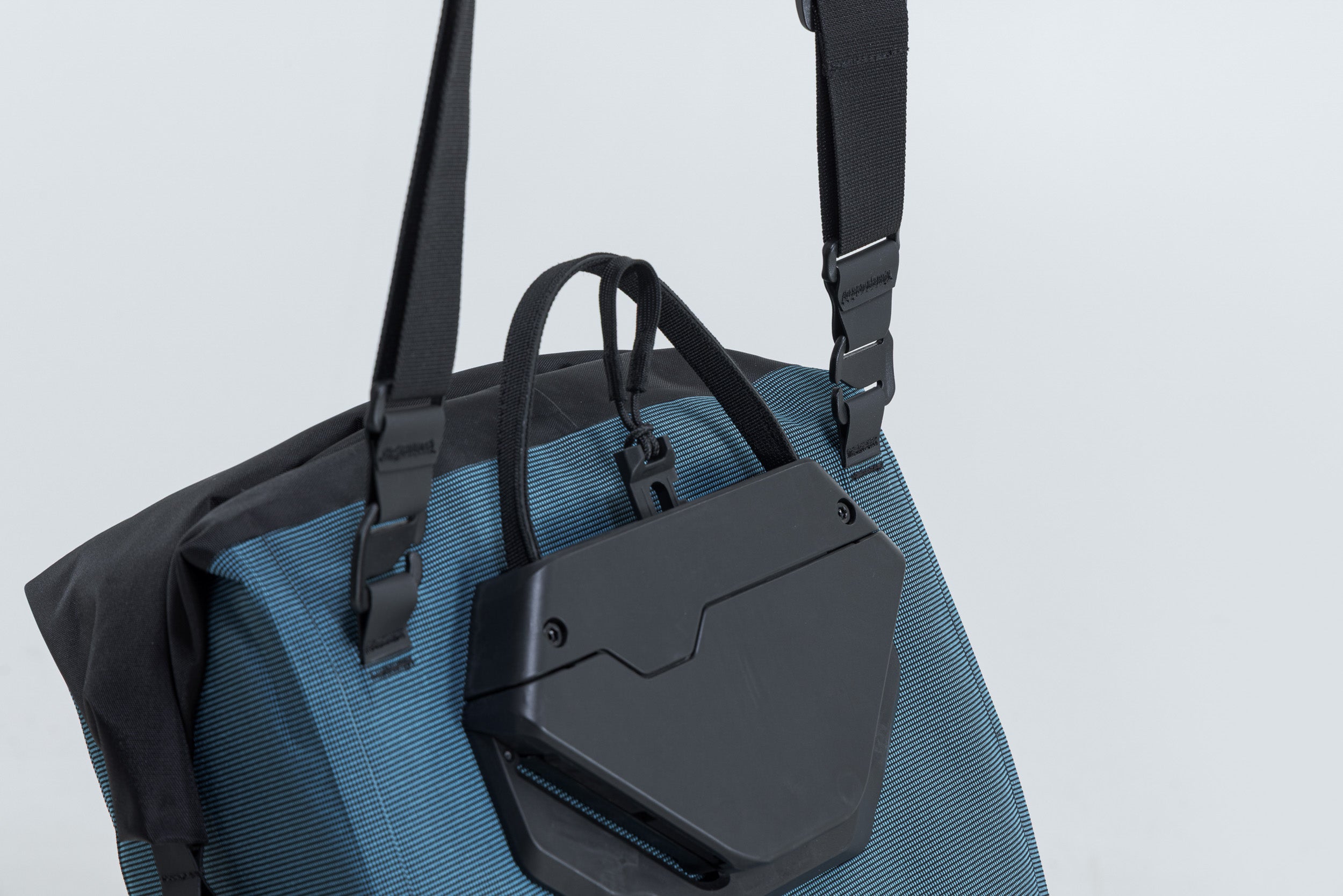 Der V-Loc Halter sichert die Sysbag schnell und sicher am Fahrrad. Die Seitentasche sitzt fest verriegelt am Träger und lässt sich durch Ziehen des Sicherungsbandes mit einem Handgriff lösen.
